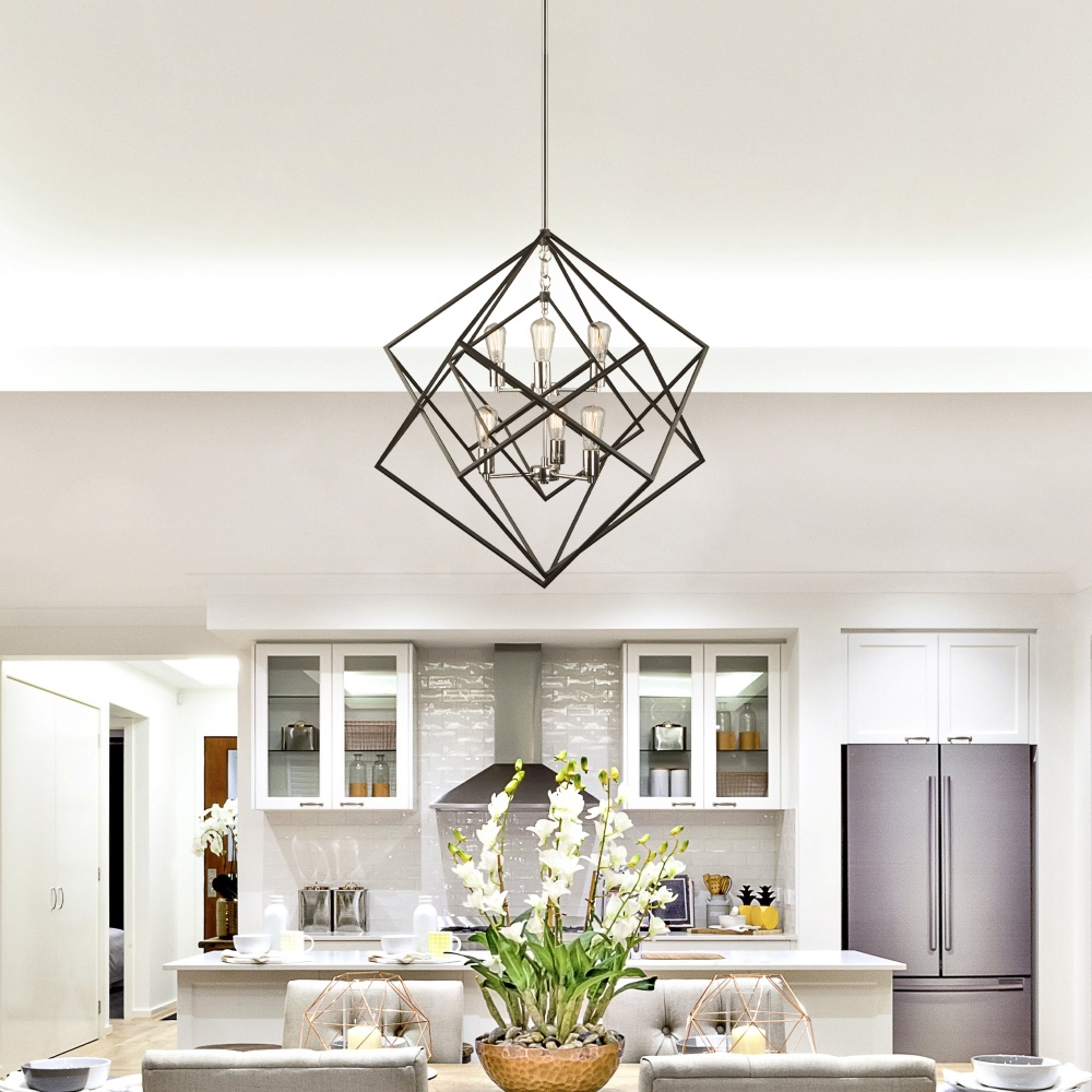 Stunning in design, this two tone multiple square chandelier from the "Artistry" collection is an instant classic. The interior has a polished nickel frame, while the exterior frame is a matte black finish. Multiple rods included with hangstraight for sloped ceilings. (Also available in black with harvest brown)