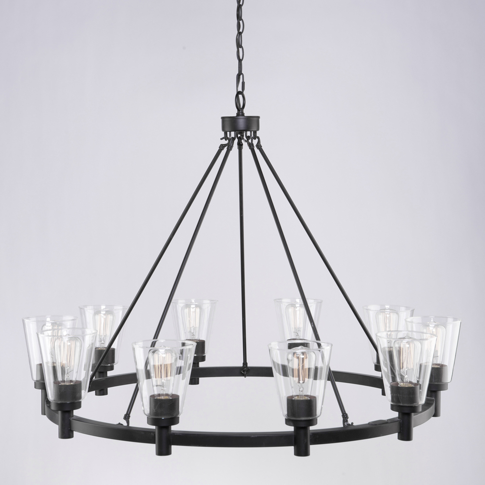The "Clarence" collection is comprised of a rich oil rubbed bronze finish that ties up with clear cone shaped glassware. Shown with retro type Edison bulbs for maximum aesthetic beauty. Also available in a plated brushed nickel version. Single tier ten light model shown.