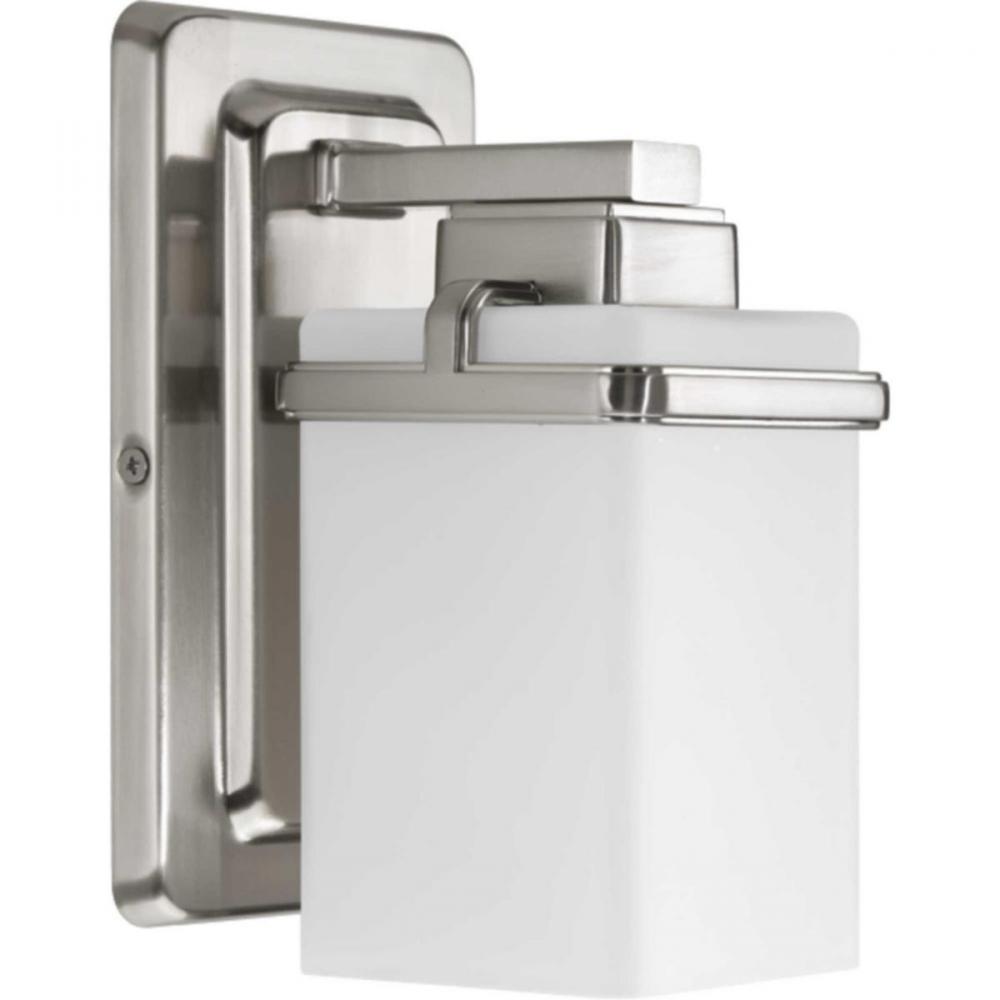 Enjoy a cool and sleek modern design with the one-light bath & vanity in the Metric Collection. A simple, etched opal glass shade nestles inside a die-cast frame - that is finished in Brushed Nickel - providing light above and below the fixture.